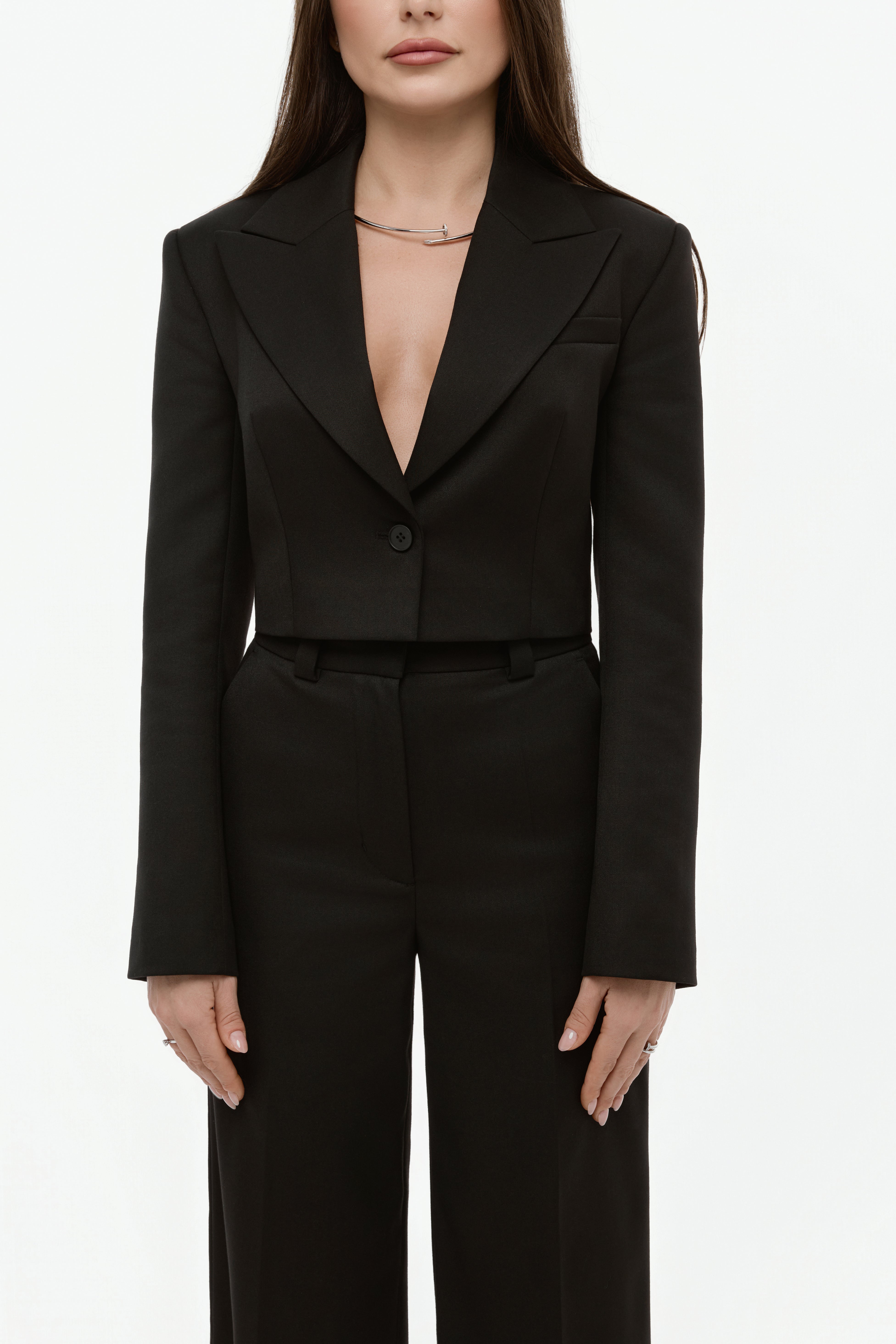 Короткий жакет із акцентним, скульптурним кроєм.