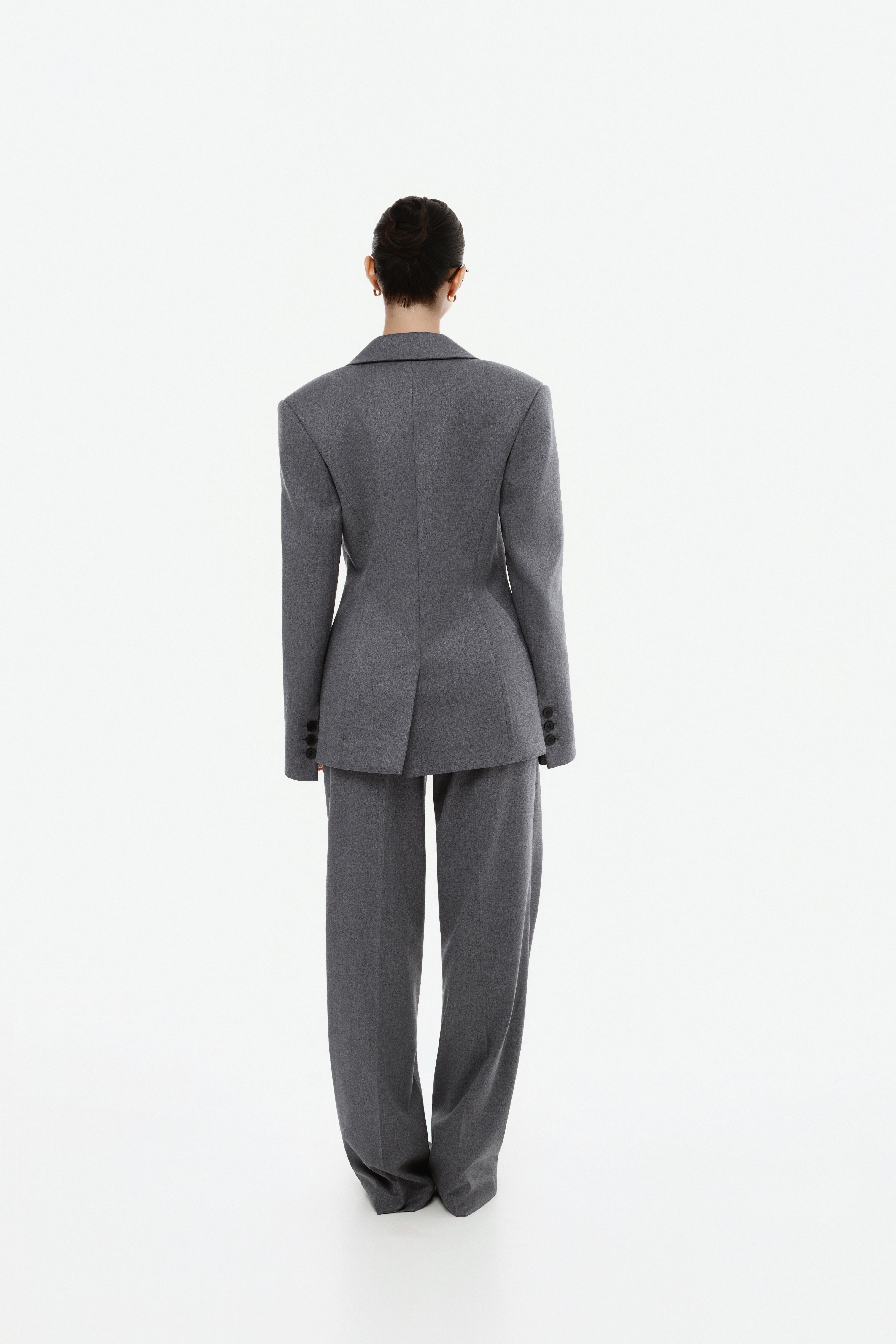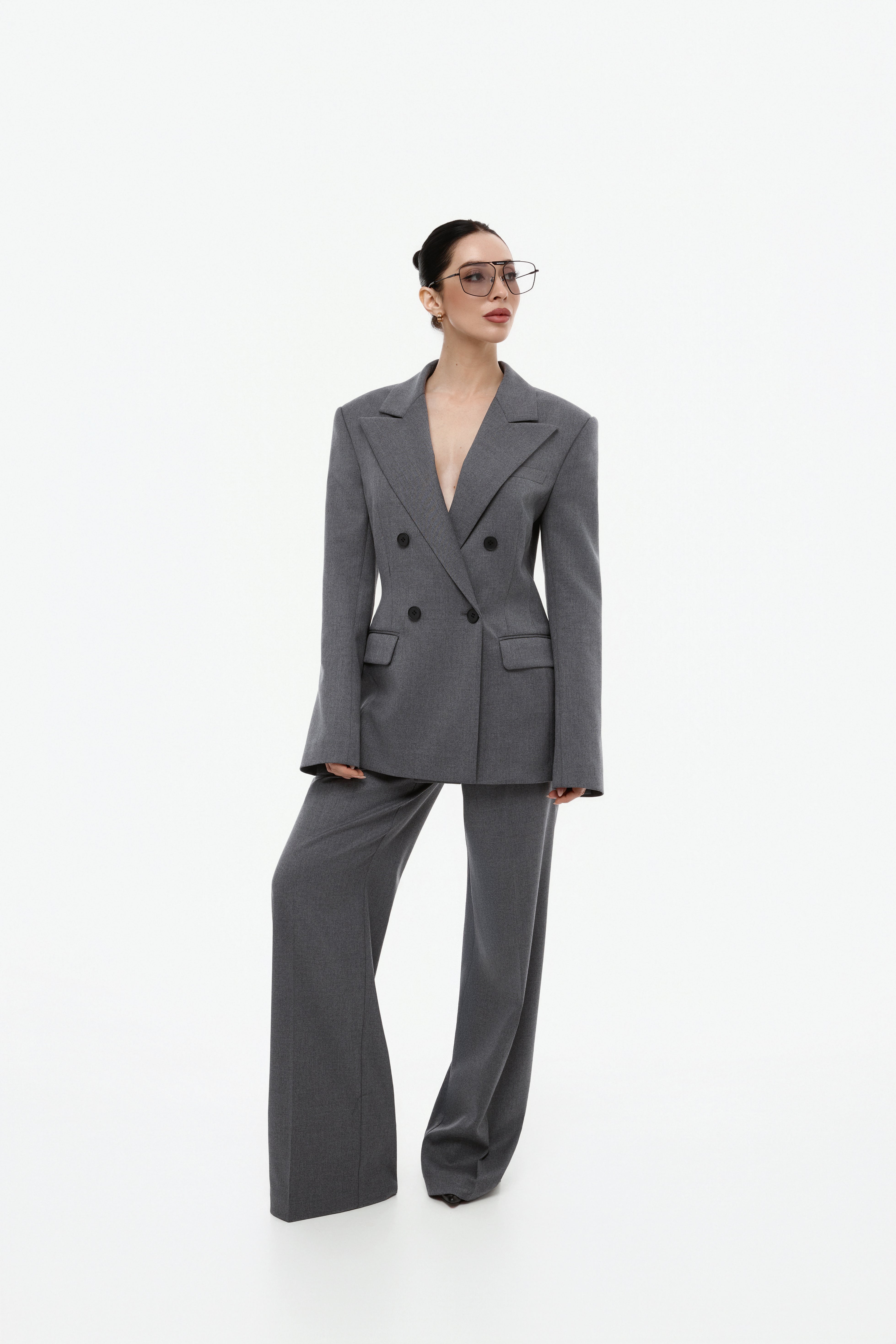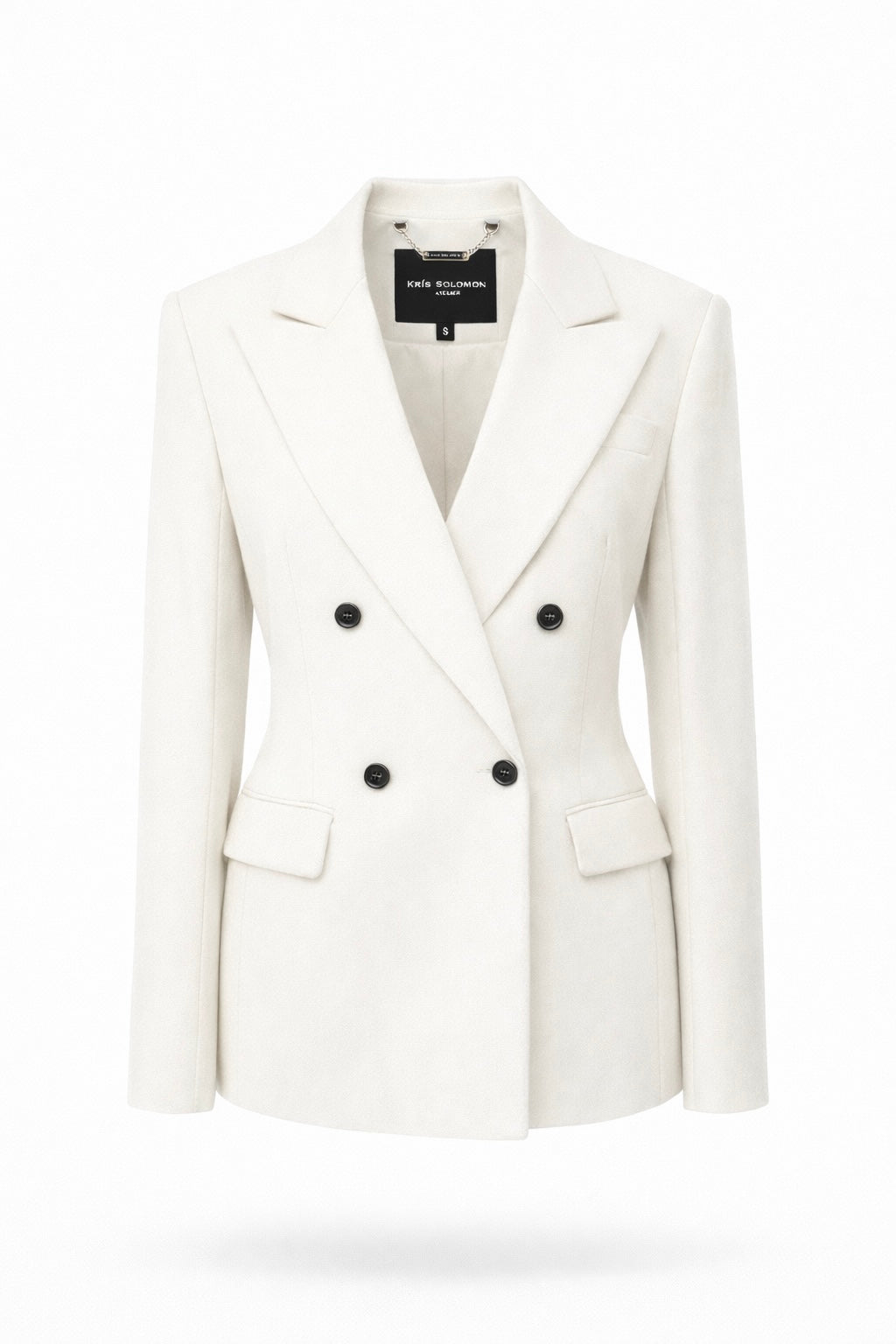 Двобортний жакет зі зібраним, врівноваженим силуетом.