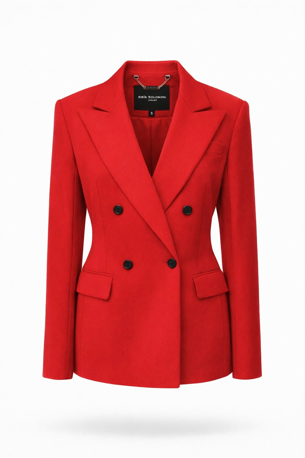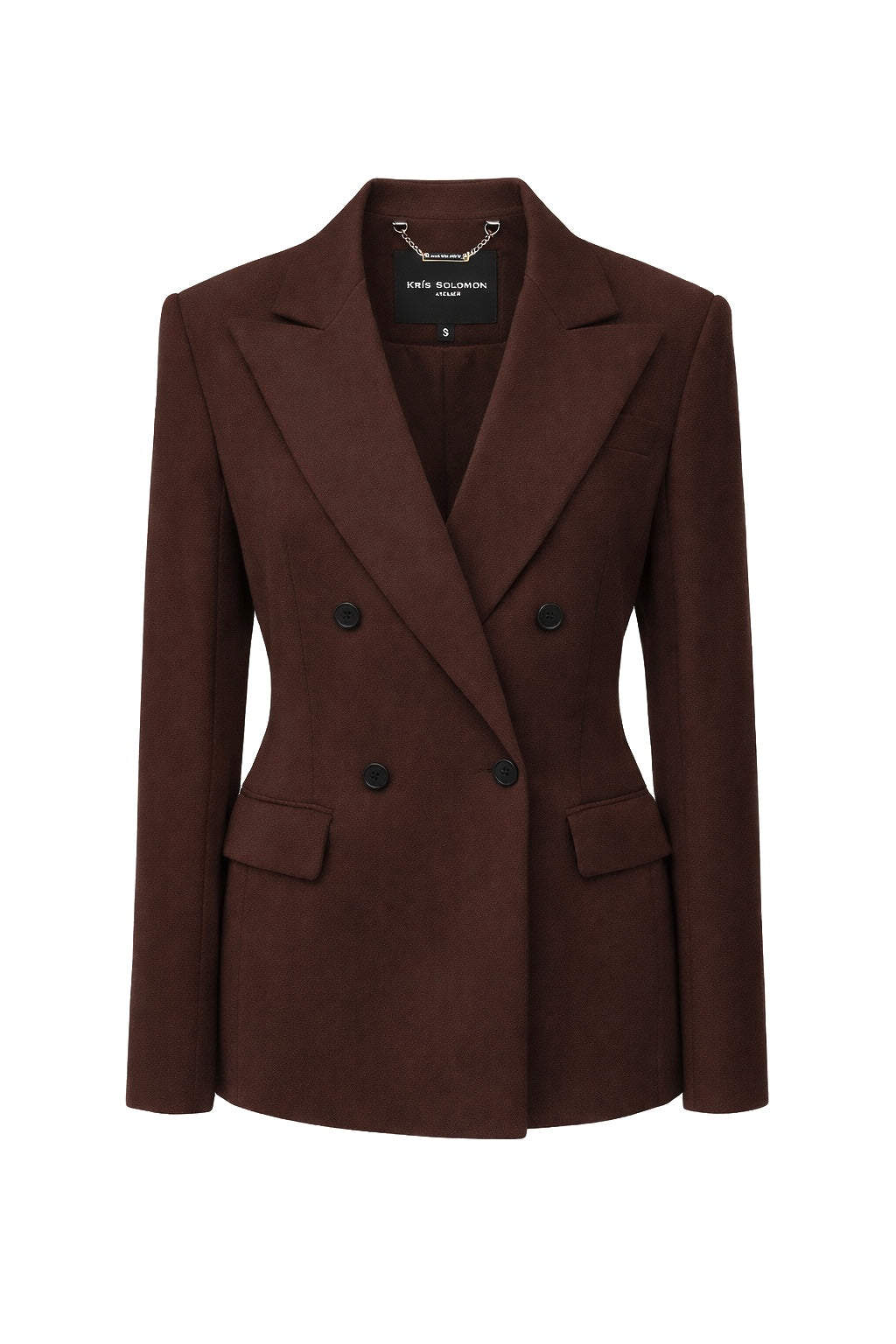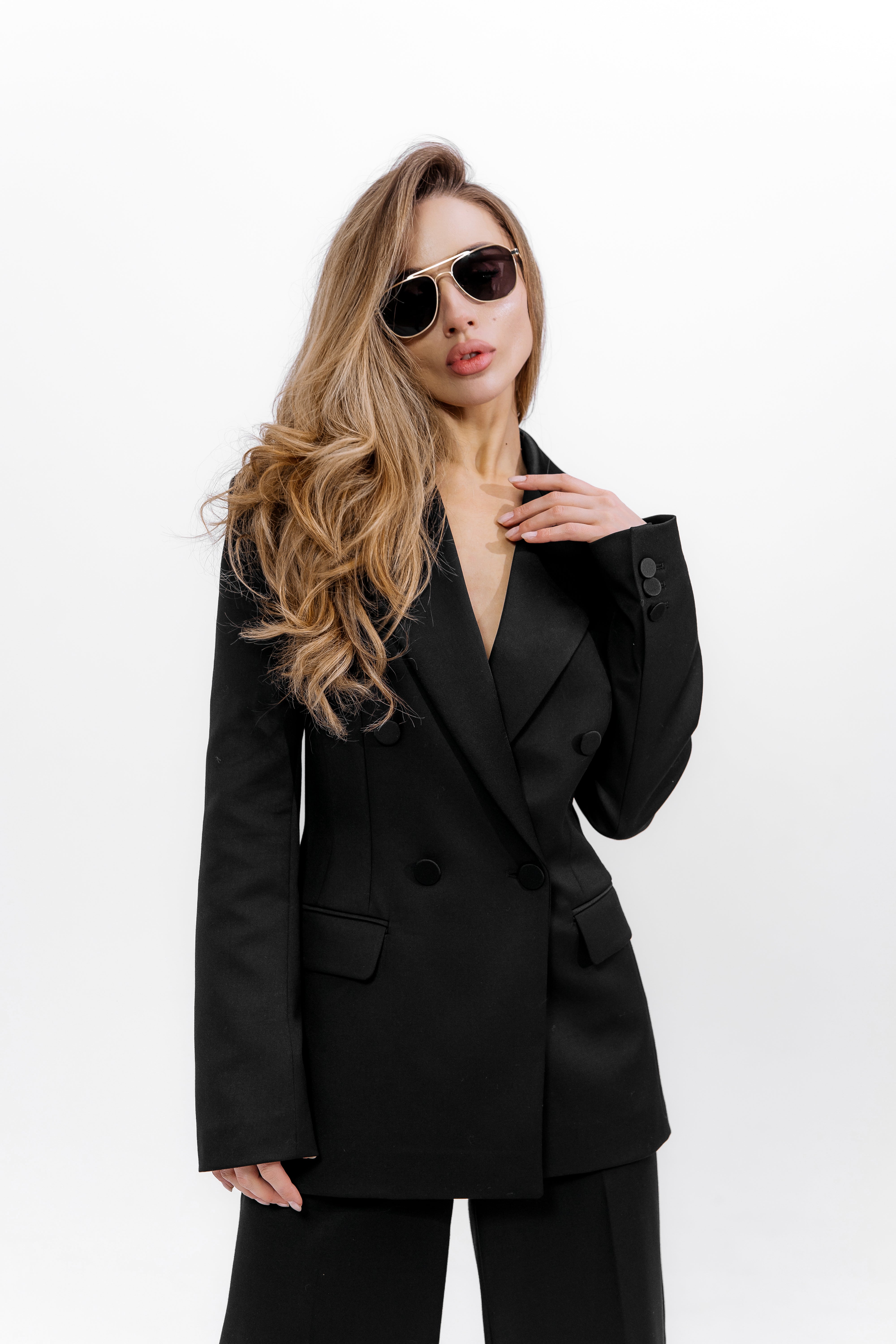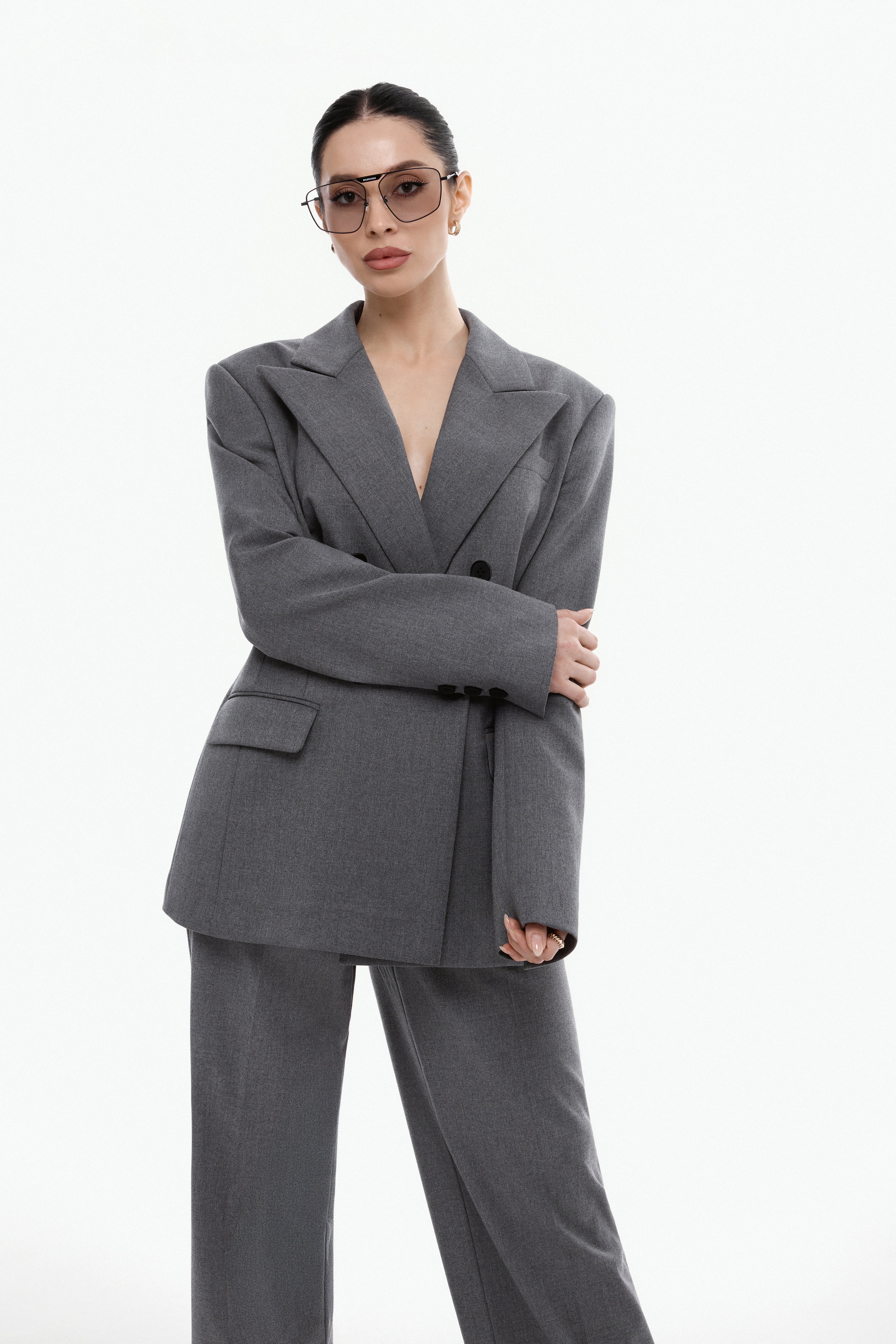 Двобортний жакет зі зібраним, врівноваженим силуетом.