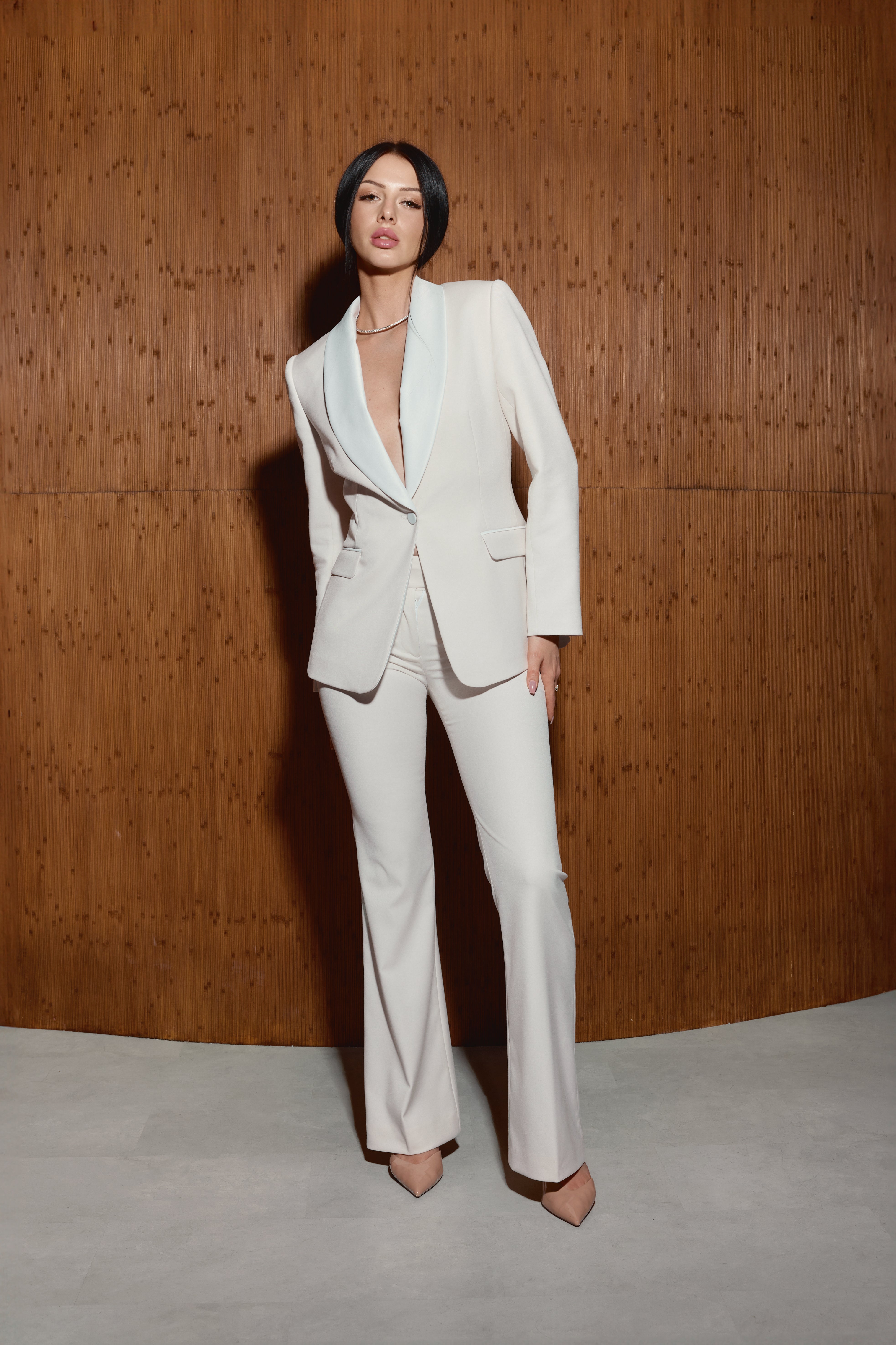 Однобортний подовжений жакет з атласним коміром формує чіткий силует із виразним акцентом на талії.