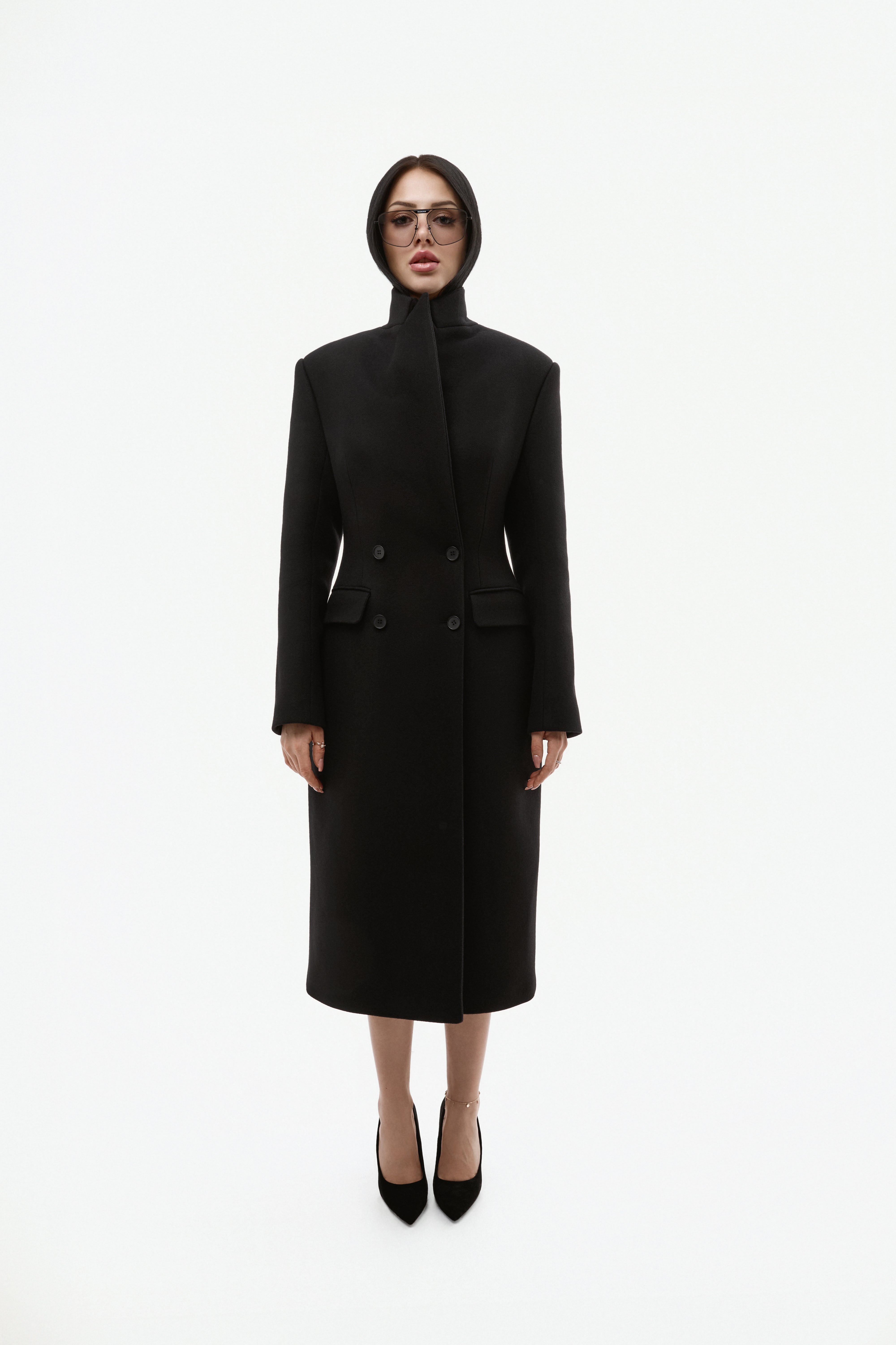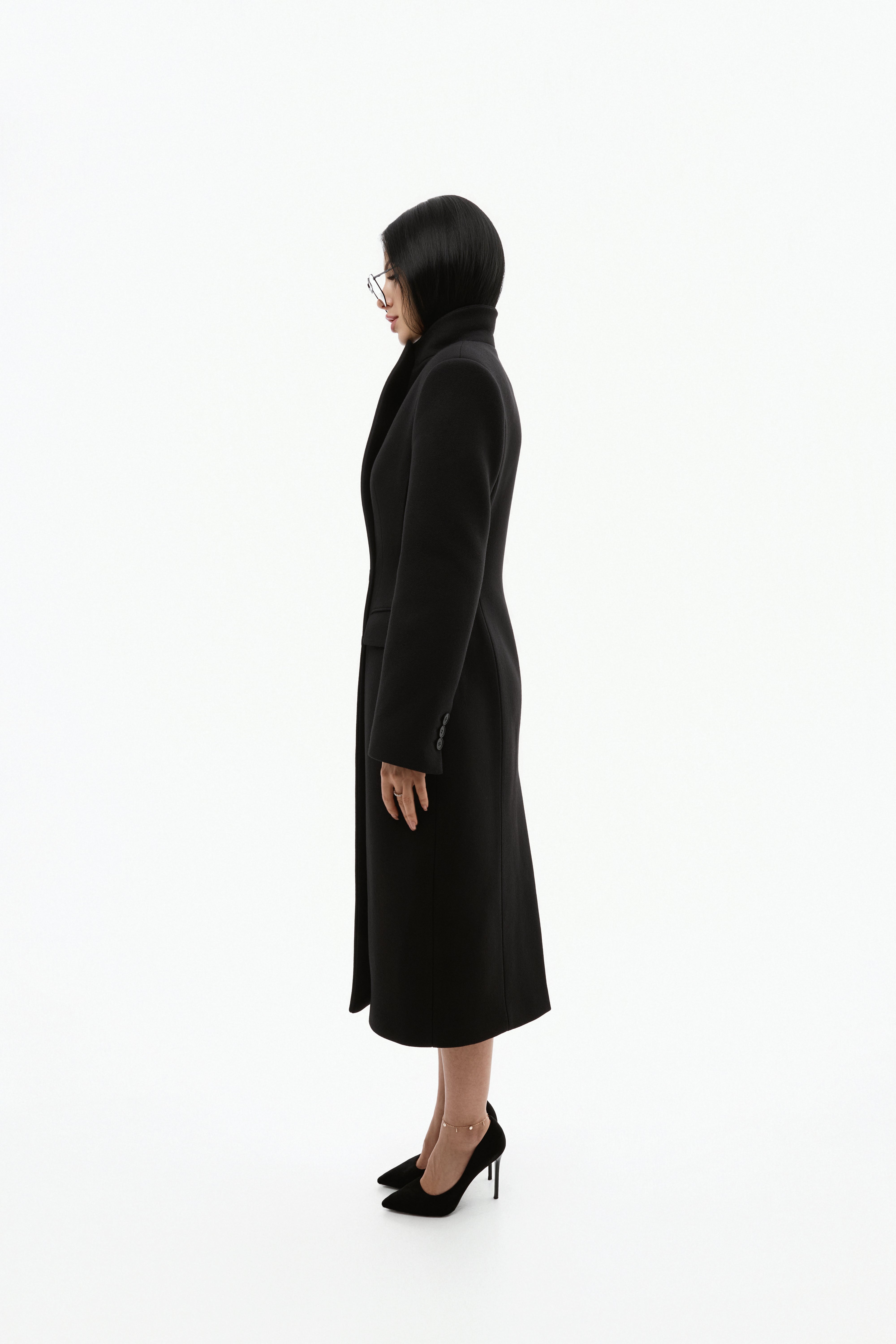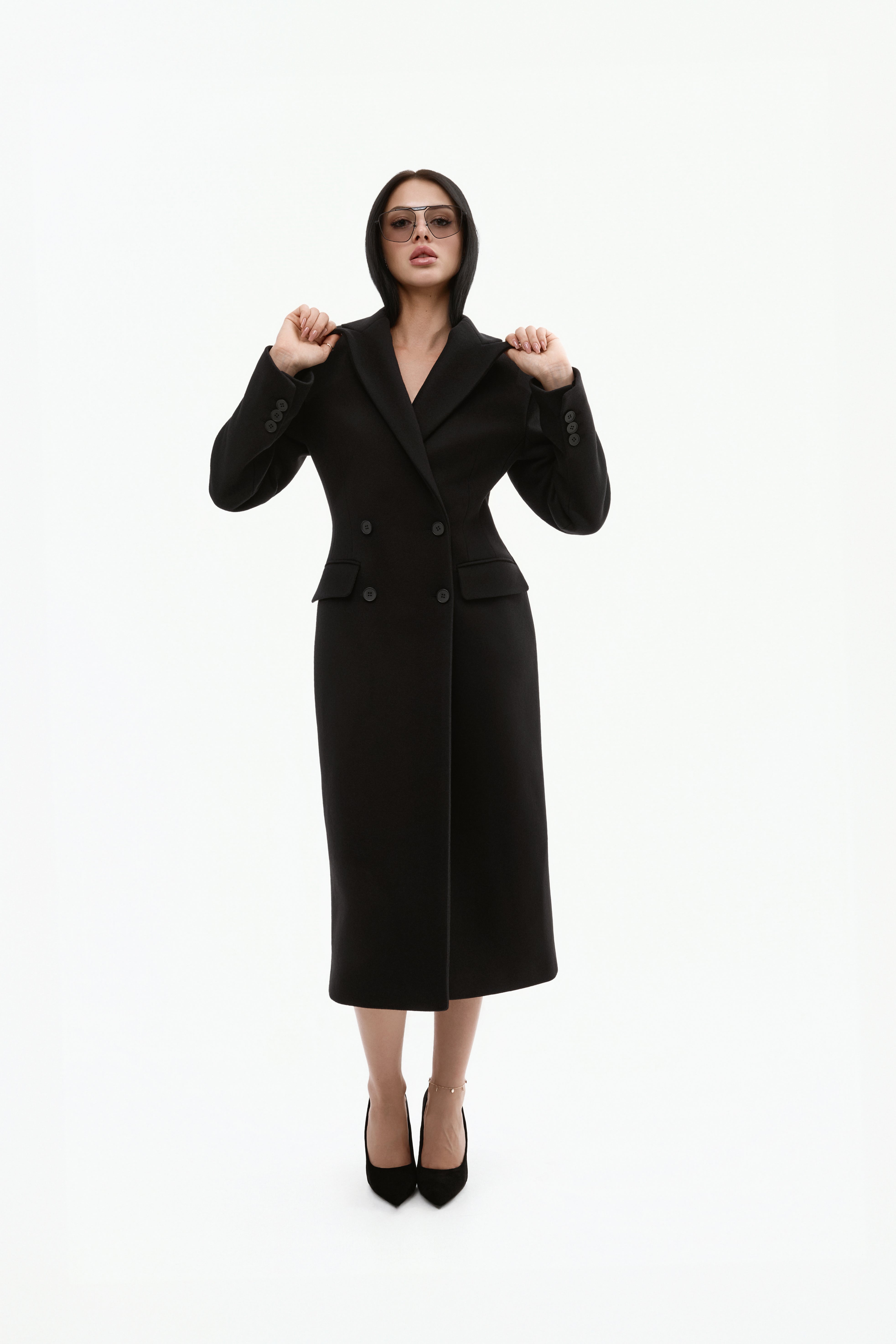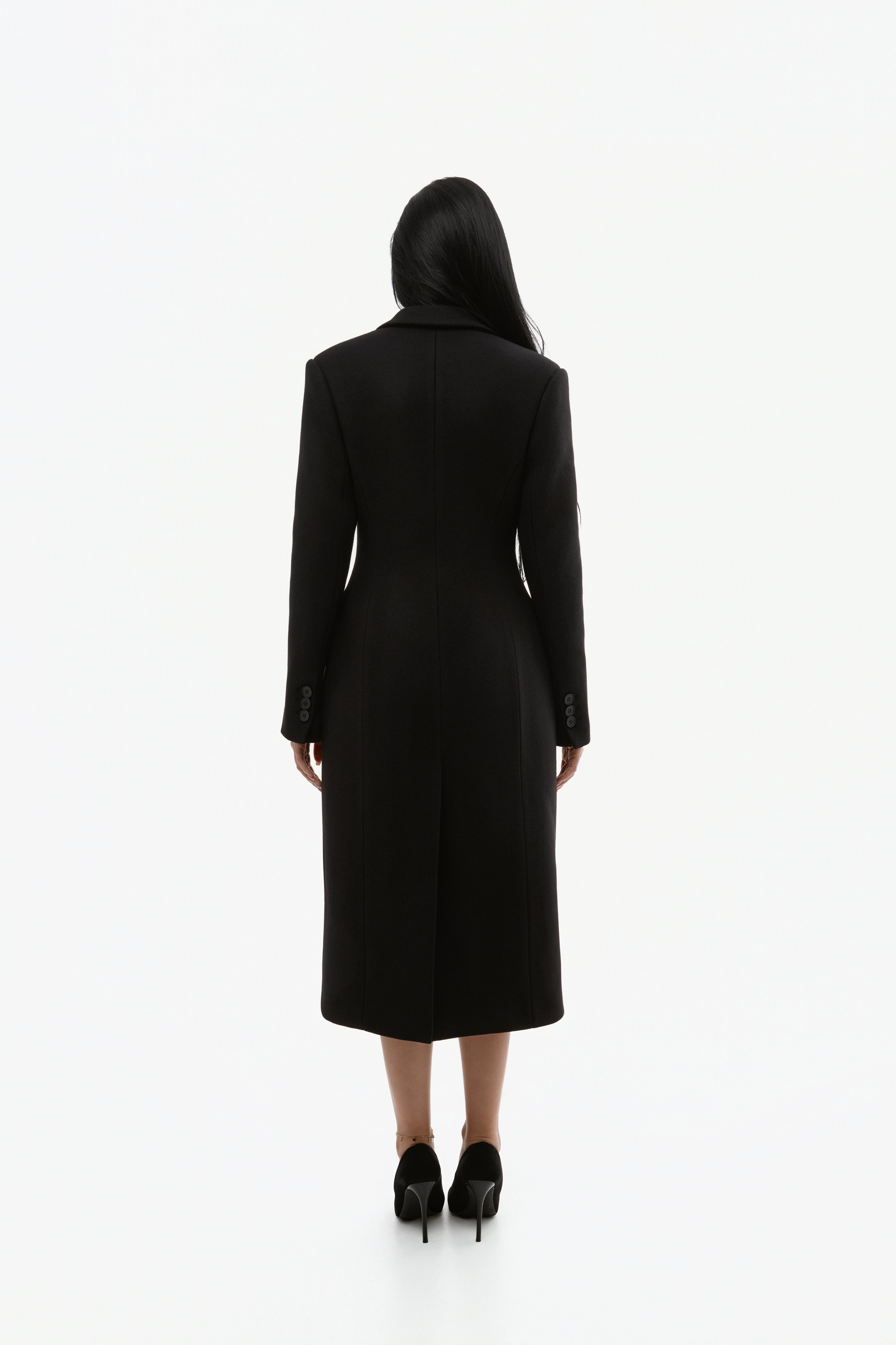 Довге двобортне пальто з вовни.